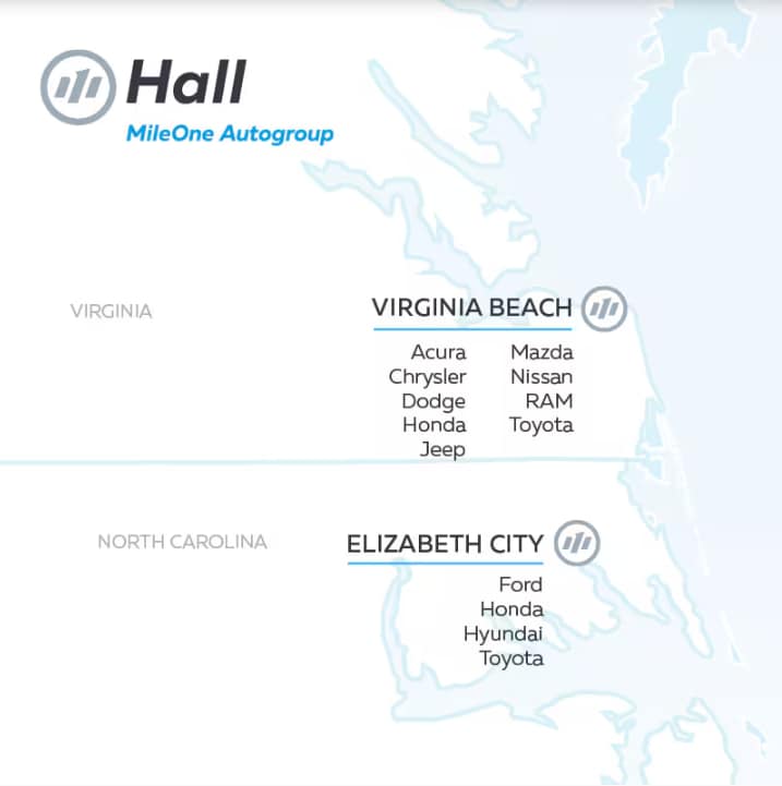 At Hall | MileOne Autogroup, our goal is to make your automotive experience simple, transparent, and rewarding. Whether you're shopping for a new vehicle, need professional service, or are exploring financing options, our team is here to help at every step. With multiple locations across Virginia, Maryland, and North Carolina, Hall | MileOne Autogroup is your trusted destination for all your automotive needs.