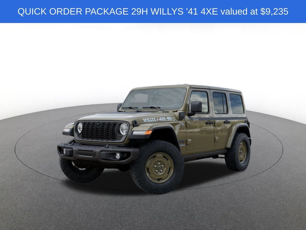 Convenience Group (2-Door Passive Entry, Front Door Locks, Air Conditioning w/Auto Temperature Control, Air Filtering, Emergency/Assistance Call, Heated Front Seats, Heated Steering Wheel, Remote Start System, and Universal Garage Door Opener), Quick Order Package 29H Willys '41 4xe (4xe 4WD Willys '41 Swing Gate Decal, 7 & 4 Pin Wiring Harness, 97 MPH Vehicle Max Speed Calibration, Auxiliary Switches, Body Color Grille w/Gloss Black Rings, Body Color Rubicon Highline Flare, Class II Receiver Hitch, Cloth Low-Back Bucket Seats (D7), Conventional Differential Front Axle, E-Locker Rear Axle, Front LED Fog Lamps, Gray/Black Trail Rated Badge, LED Premium Reflector Headlamps, Matte Black Jeep Badge, MOPAR All-Weather Floor Mats, Off-Road Plus Mode, Premium Tan Sunrider Soft Top (STC), Steel Front Bumper, Steel Rear Bumper, Wheels: 17" x 7.5" Painted Body Color, Willy's Suspension, Willys '41 Retro Edition Buzz Model, Willys '41 Retro Edition Hood Decal, Willys '41 Retro Edition PHEV Decal, Willys '41 Retro Edition Tailgate Plaque, Willys '41 Retro Edition Wrangler Decal, Willys '41 Retro Shift Bezel Insert, and Willys '41 US Edition U.S Hood Decal), Safety Group (Auto High Beam Headlamp Control, Blind Spot & Cross Path Detection, LED Taillamps, and ParkSense Rear Park Assist System), Technology Group (A/C Power Box Inverter (PHEV), Alpine Premium Audio System, and EV/PHEV Vehicle To Load), 2.0L I4 DOHC, 4-Wheel Disc Brakes, 8 Speakers, ABS brakes, Air Conditioning, Alloy wheels, AM/FM radio: SiriusXM, Apple CarPlay/Android Auto, Body Color 3-Piece Hard Top, Brake assist, Cloth Low-Back Bucket Seats, Compass, Delay-off headlights, Driver door bin, Driver vanity mirror, Dual front impact airbags, Dual front side impact airbags, Electronic Stability Control, Freedom Panel Storage Bag, Front anti-roll bar, Front Bucket Seats, Front Center Armrest w/Storage, Front fog lights, Front License Plate Bracket (DISC), Front reading lights, Fully automatic headlights, Heated door mirrors, Illuminated entry, Integrated roll-over protection, Low tire pressure warning, MOPAR Doors Off Mirror Kit, MOPAR Satin Black Grille, Occupant sensing airbag, Outside temperature display, Overhead airbag, Panic alarm, ParkView Rear Back-Up Camera, Passenger door bin, Passenger vanity mirror, Power door mirrors, Power steering, Power windows, Radio data system, Radio: Uconnect 5 w/12.3" Display, Rear anti-roll bar, Rear reading lights, Rear Window Defroster, Rear Window Wiper/Washer, Remote keyless entry, Security system, Speed control, Split folding rear seat, Sport Suspension, Steering wheel mounted audio controls, Tachometer, Telescoping steering wheel, Tilt steering wheel, Traction control, Trip computer, Variably intermittent wipers, Voltmeter, and