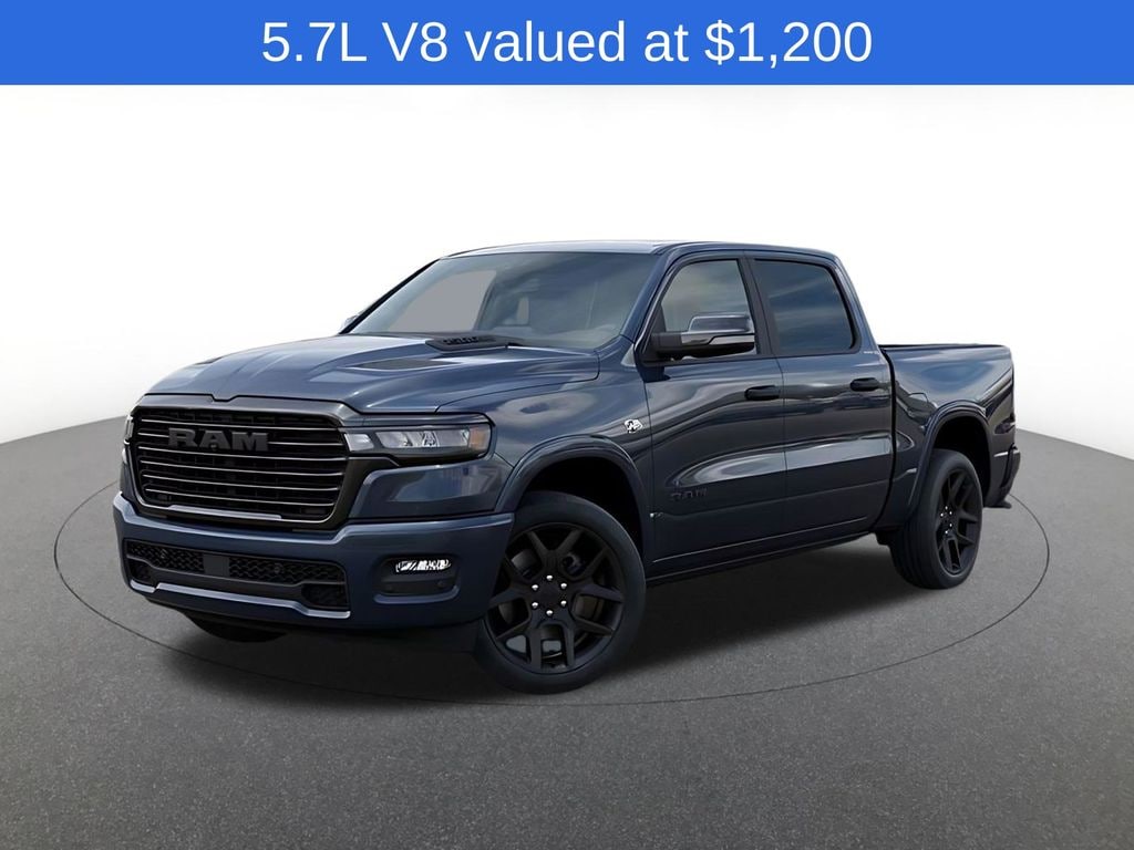 Advanced Safety Group II (12-Way/1-Way Trailer Connector, Active Driving Assist System, Drowsy Driver Detection, Evasive Steer Assist, Exterior Mirrors Approach Lamps, Intersection Collision Assist System, Surround View Camera System, and Traffic Sign Recognition), Bed Utility Group (Exterior 115V AC Outlet, MOPAR 4 Adjustable Cargo Tie-Down Hooks, and MOPAR Spray in Bedliner), Laramie Level 2 Equipment Group (14.4" Touchscreen Display, 4G LTE Wi-Fi Hot Spot, Cluster 12" TFT Color Display, Connected Travel and Traffic Services, Connectivity - US/Canada, Front Passenger Interactive Display, GPS Navigation, Harman/Kardon 19 Speaker Premium Sound, Integrated Center Stack Radio, Integrated Voice Command with Bluetooth, Power Tailgate, Radio: Uconnect 5 Nav with 14.4" Display, Rain Sensitive Windshield Wipers, SiriusXM Radio Service, SiriusXM with 360L, and USB Host Flip), Night Edition (Accent Color Door Handles, Accent Color Premium Power Mirrors, Accent Color Tailgate Handle, Anti-Spin Differential Rear Axle, Auto Power-Folding Mirrors, Auto-Dimming Exterior Driver Mirror, Black Exterior Truck Badging, Black Headlamp Bezels, Black Interior Accents, Black Painted Exterior Mirrors Caps, Black Tail Lamp Bezels, Body Color Front Bumper, Body Color Rear Bumper with Step Pads, Convex Wide-Angle Exterior Mirror Insert, Dual Exhaust with Black Tips, Exterior Mirrors Courtesy Lamps, Exterior Mirrors with Heating Element, Exterior Mirrors with Memory, Exterior Mirrors with Supplemental Signals, Grille Surround 3 Black Texture 2 Black, Pirelli Brand Tires, Proximity Approach/Departure Lamps, RAM Grille Badge - Black, Sport Performance Hood, and Wheels: 22" x 9" Forged Aluminum), Quick Order Package 27H Laramie, 10 Speakers, 4-Corner Air Suspension, 4-Wheel Disc Brakes, ABS brakes, Active Noise Control System, Adjustable pedals, Air Conditioning, Alloy wheels, AM/FM radio: SiriusXM with 360L, Apple CarPlay/Android Auto, Audio memory, Auto High-beam Headlights, Auto-dimming door mirrors, Auto-dimming Rear-View mirror, Automatic temperature control, Brake assist, Bumpers: chrome, Chrome Exterior Mirrors, Compass, Delay-off headlights, Driver door bin, Driver vanity mirror, Dual front impact airbags, Dual front side impact airbags, Electronic Stability Control, Front anti-roll bar, Front Bucket Seats, Front Center Armrest w/Storage, Front dual zone A/C, Front fog lights, Front License Plate Bracket, Front reading lights, Front wheel independent suspension, Fully automatic headlights, Garage door transmitter, Heated door mirrors, Heated front seats, Heated rear seats, Heated steering wheel, Illuminated entry, Leather steering wheel, Leather Trimmed Bucket Seats, Low tire pressure warning, Memory seat, MOPAR Front and Rear Rubber Floor Mats, Navigation System, Occupant sensing airbag, Off-Road Information Pages, Outside temperature display, Overhead airbag, Overhead console, Panic alarm, Par