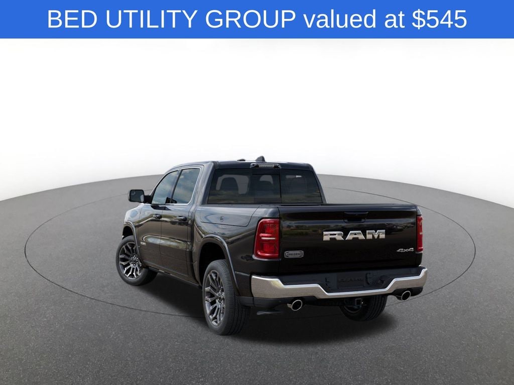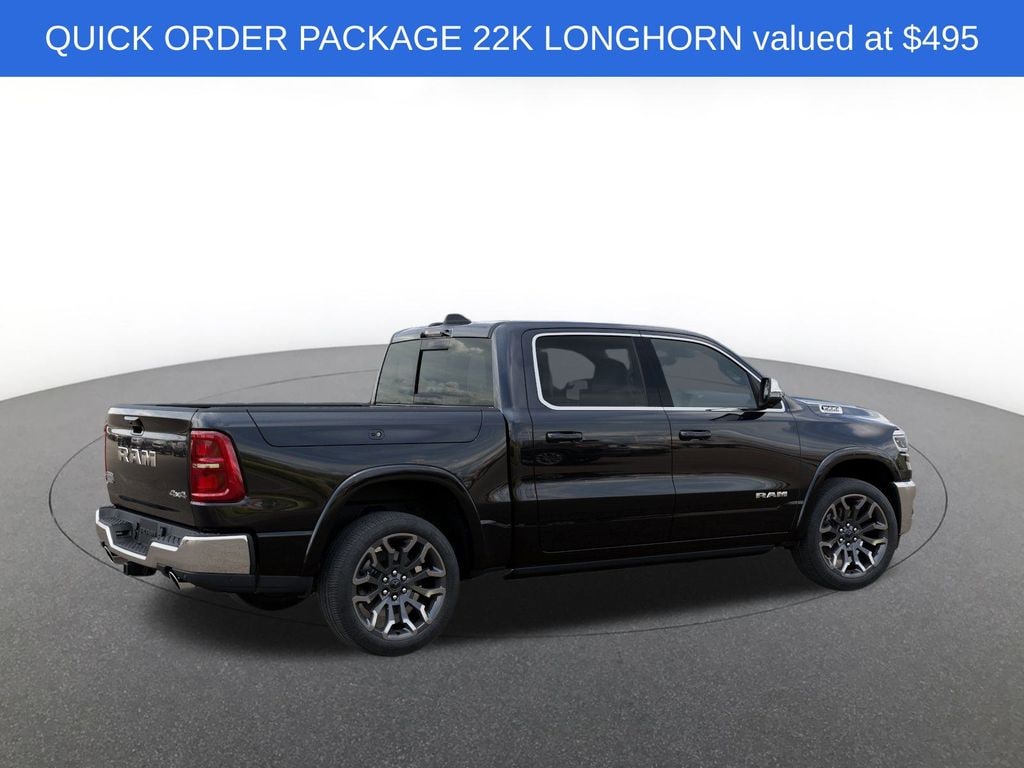 Bed Utility Group (Exterior 115V AC Outlet and MOPAR 4 Adjustable Cargo Tie-Down Hooks), Limited Level An Equipment Group (12-Way/1-Way Trailer Connector, 14.4" Touchscreen Display, 240 Amp Alternator, 4G LTE Wi-Fi Hot Spot, Apple CarPlay, Connected Travel and Traffic Services, Connectivity - US/Canada, Disassociated Touchscreen Display, Drowsy Driver Detection, Evasive Steer Assist, Global Telematics Box Module, Google Android Auto, GPS Antenna Input, GPS Navigation, Hands-Free Active Driving Assist System, HD Radio, Heads-Up Display, Integrated Center Stack Radio, Integrated Voice Command with Bluetooth, Intersection Collision Assist System, LED CHMSL Lamp, Radio: Uconnect 5 Nav with 14.4" Display, RamBox Cargo Management System, SiriusXM Radio Service, SiriusXM with 360L, Smartphone as a Key Capable, Surround View Camera System, Traffic Sign Recognition, Tri-Fold Tonneau Cover, and USB Host Flip), Quick Order Package 22K Longhorn (Grille Surround 4 Chrome Texture 5 Chrome, Longhorn Badge, Longhorn Instrument Cluster Theme 3, Premium Door Trim Panel, Premium Filigree Leather Seats, and Warm Chrome Key Fob), 19 Speakers, 3.92 Rear Axle Ratio, 4-Wheel Disc Brakes, ABS brakes, Active Noise Control System, Adjustable pedals, Air Conditioning, Alloy wheels, AM/FM radio, Apple CarPlay/Android Auto, Audio memory, Auto High-beam Headlights, Auto Power-Folding Mirrors, Auto-dimming door mirrors, Auto-Dimming Exterior Driver Mirror, Auto-dimming Rear-View mirror, Auto-leveling suspension, Automatic temperature control, Bodyside moldings, Brake assist, Bumpers: chrome, Chrome Exterior Mirrors, Compass, Convex Wide-Angle Exterior Mirror Insert, Delay-off headlights, Driver door bin, Driver vanity mirror, Dual front impact airbags, Dual front side impact airbags, Electronic Stability Control, Exterior Mirrors Courtesy Lamps, Exterior Mirrors with Heating Element, Exterior Mirrors with Memory, Exterior Mirrors with Supplemental Signals, Exterior Parking Camera Rear, Front anti-roll bar, Front Bucket Seats, Front Center Armrest w/Storage, Front dual zone A/C, Front fog lights, Front License Plate Bracket, Front reading lights, Front wheel independent suspension, Fully automatic headlights, Garage door transmitter, Genuine wood console insert, Genuine wood dashboard insert, Genuine wood door panel insert, Heated door mirrors, Heated front seats, Heated rear seats, Heated steering wheel, Illuminated entry, Leather steering wheel, Low tire pressure warning, Manufacturer's Statement of Origin, Memory seat, Navigation System, Occupant sensing airbag, Outside temperature display, Overhead airbag, Overhead console, Panic alarm, Passenger door bin, Passenger vanity mirror, Pedal memory, Pirelli Brand Tires, Powe