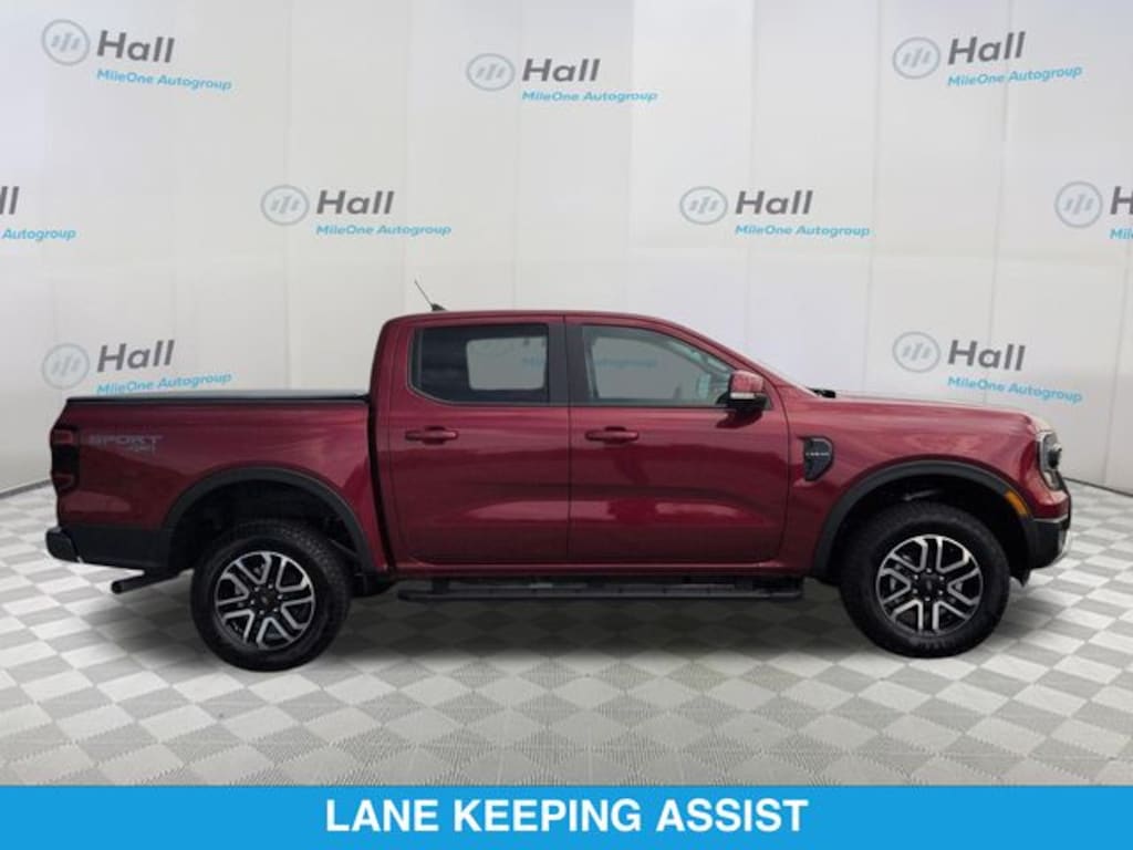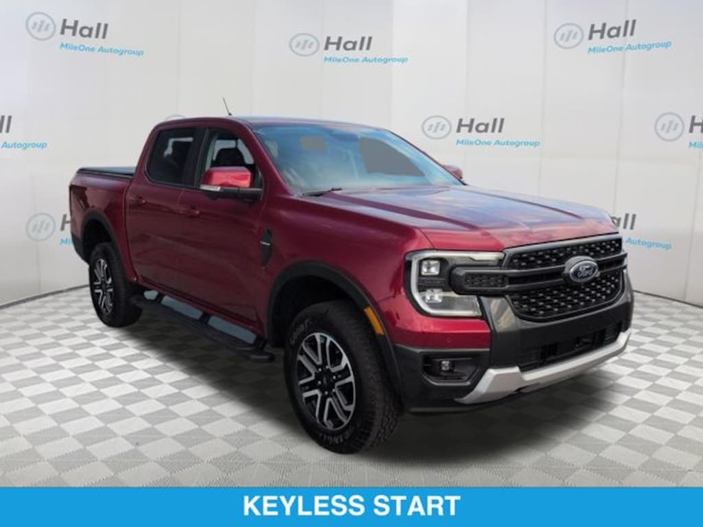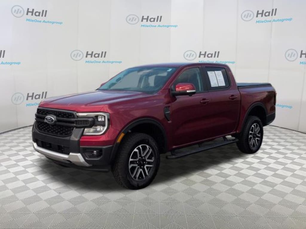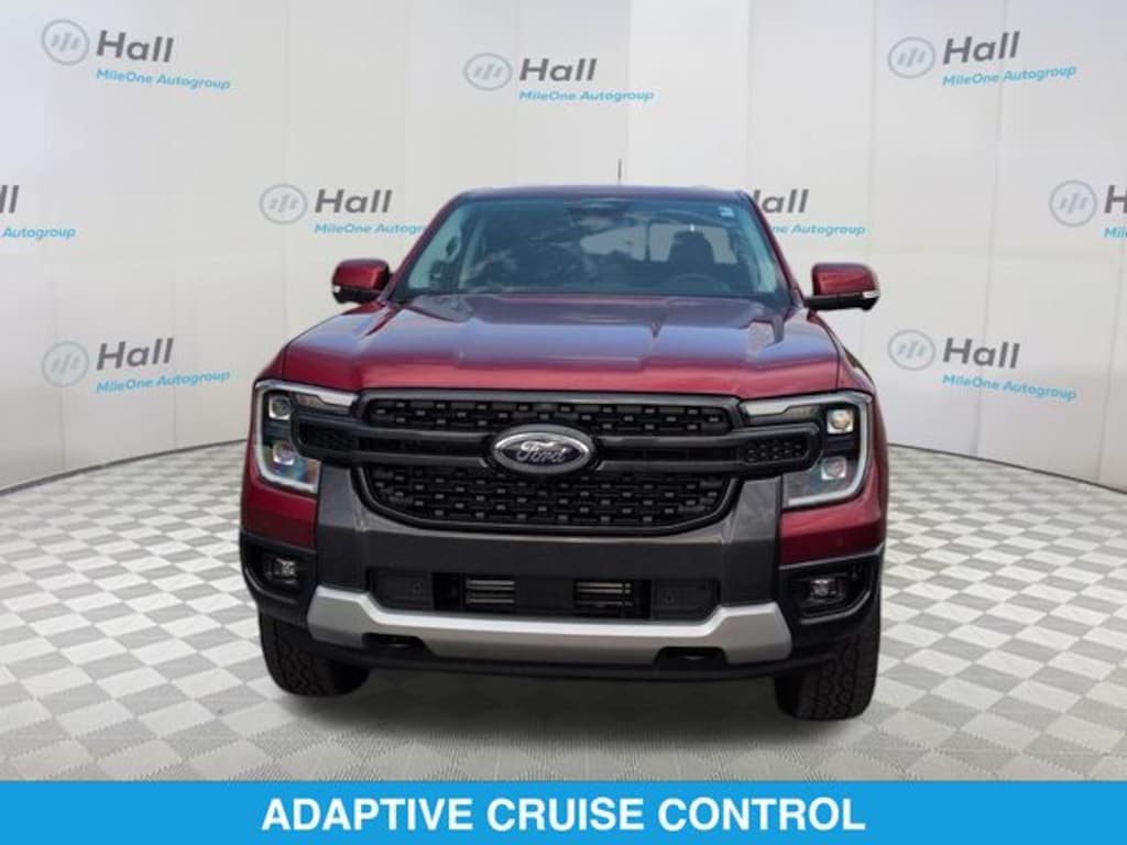 Ruby Red Metallic 2025 Ford Ranger Lariat 4WD 10-Speed Automatic 2.7L EcoBoost V6 We are currently offering Vehicle Purchase Home Delivery by appointment. Please contact for details., 4WD, 10 Speakers, 3.73 Axle Ratio, 4-Wheel Disc Brakes, ABS brakes, Advanced Towing Package, Air Conditioning, Alloy wheels, AM/FM radio: SiriusXM, Auto High-beam Headlights, Auto-dimming Rear-View mirror, Automatic temperature control, Brake assist, Class IV Trailer Hitch Receiver, Compass, Delay-off headlights, Driver door bin, Driver vanity mirror, Dual front impact airbags, Dual front side impact airbags, Electronic Stability Control, Emergency communication system: SYNC 4 911 Assist, Equipment Group 500A Standard, Front anti-roll bar, Front Bucket Seats, Front Center Armrest, Front dual zone A/C, Front fog lights, Front reading lights, Front wheel independent suspension, Fully automatic headlights, Garage door transmitter, Gray Painted Center Bar & Grille Surround, Gray Painted Front Fascia & Rear Bumper, Heated door mirrors, Heated front seats, Heated steering wheel, Illuminated entry, Internet access capable: FordPass Connect 4G, Leather Shift Knob, Leather steering wheel, Leather-Trimmed Front Heated Bucket Seats, Low tire pressure warning, Memory seat, Navigation system: Connected Navigation, Occupant sensing airbag, Outside temperature display, Overhead airbag, Overhead console, Panic alarm, Passenger door bin, Passenger vanity mirror, Power door mirrors, Power driver seat, Power passenger seat, Power steering, Power windows, Pro Trailer Backup Assist, Radio: B&O Sound System by Bang & Olufsen, Rain sensing wipers, Rear Parking Sensors w/Trailer Guidance, Rear reading lights, Rear seat center armrest, Rear step bumper, Rear window defroster, Remote keyless entry, Security system, SiriusXM Satellite Radio, Speed control, Speed-sensing steering, Sport Appearance Package, Sport Box Decal, Steering wheel mounted audio controls, SYNC 4A w/Connected Navigation, Telescoping steering wheel, Tilt steering wheel, Traction control, Trailer Brake Controller, Trailer Tow Package, Trip computer, Turn signal indicator mirrors, Variably intermittent wipers, Voltmeter, Wheels: 18" Machined Aluminum w/Dark Pockets, 4WD.